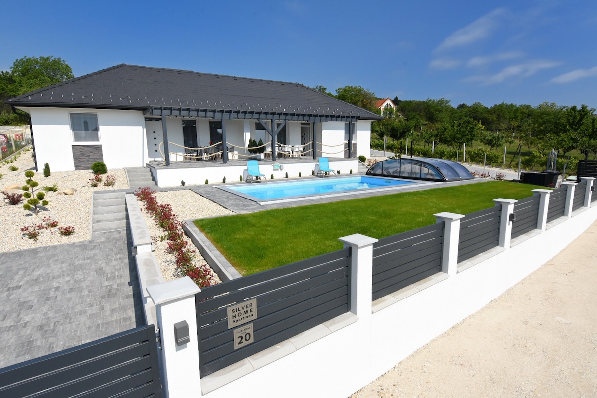 Medencével,jakuzzival,terasszal és kertel rendelkező újonnan épített részleges balatoni panorámás Silver Home **** szálláshely Balatonalmádiba található.Az apartmanok ingyenes wifivel, légkondicionálással várja pihenésre vágyó vendégeit.