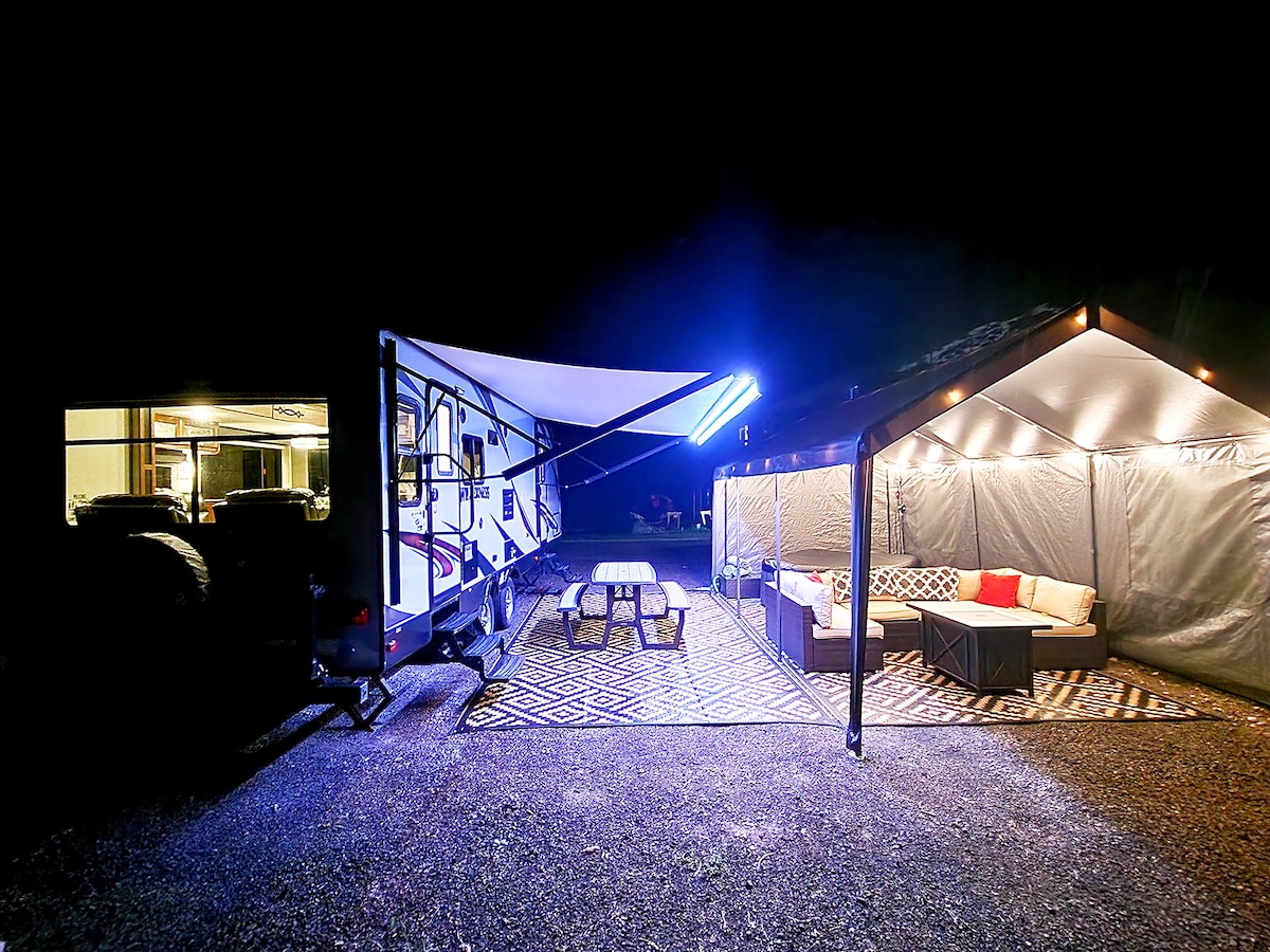 Uživajte u našem čistom kamp prikolici od 27 stopa na 5 hektara, šumovito, bezbjedno i privatno. Imajte na umu da se objekat dijeli sa vlasnicima nekretnina. Sadrži prostrani dnevni boravak sa TV-om, veliko kupatilo i bračni krevet sa novim dušekom od memorijske pjene od 10inča. Uživajte u natkrivenom prostoru za sjedenje sa stolom, stolicama i propanskim ognjištem ili se izležavajte oko našeg vanjskog ognjišta sa rešetkom za kuvanje, dok posmatrate zvijezde i posmatrate divlje životinje. Opustite se