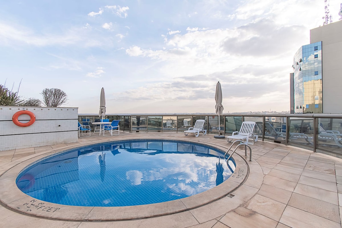 U blizini aerodroma, stanice metroa i najboljeg tržnog centra u Braziliji. Lak pristup tržnim centrima i centrima za slobodno vrijeme. Udoban i ukusan, privatni parking, Wi-Fi, kablovska televizija, Netflix, klima-uređaj u dnevnom boravku i spavaćoj sobi, mikrotalasna pećnica, električna rerna, šporet, frižider, opremljena kuhinja. Kondominijum ima mogućnost 3 restorana sa raznovrsnim jelovnikom i doručkom, ručkom i grickalicama, kao i 24-satnu samoposlužnu pogodnost. Bazen, sauna i akademija. Potpuno nova posteljina.