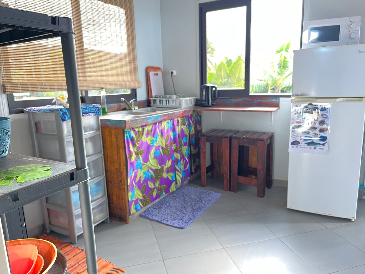 Nezavisni dupleks bungalov, uz plažu, nalazi se u privatnom vlasništvu. 1 klimatizovana soba sa 1 velikim bračnim krevetom + 1 kauč na razvlačenje. Kuhinja i kupatilo. Privatna terasa na otvorenom u bašti uz obalu. 2 kajaka su dostupna za pristup pješčanoj obali 100 metara od faréa i mjesta za surfovanje u Taapuni, udaljenom 800 m. Međunarodni /interislandski aerodrom 10 minuta automobilom. Supermarket je otvoren 24 sata na 10 minuta hoda. Obližnji restorani, grickalice i prikolice.