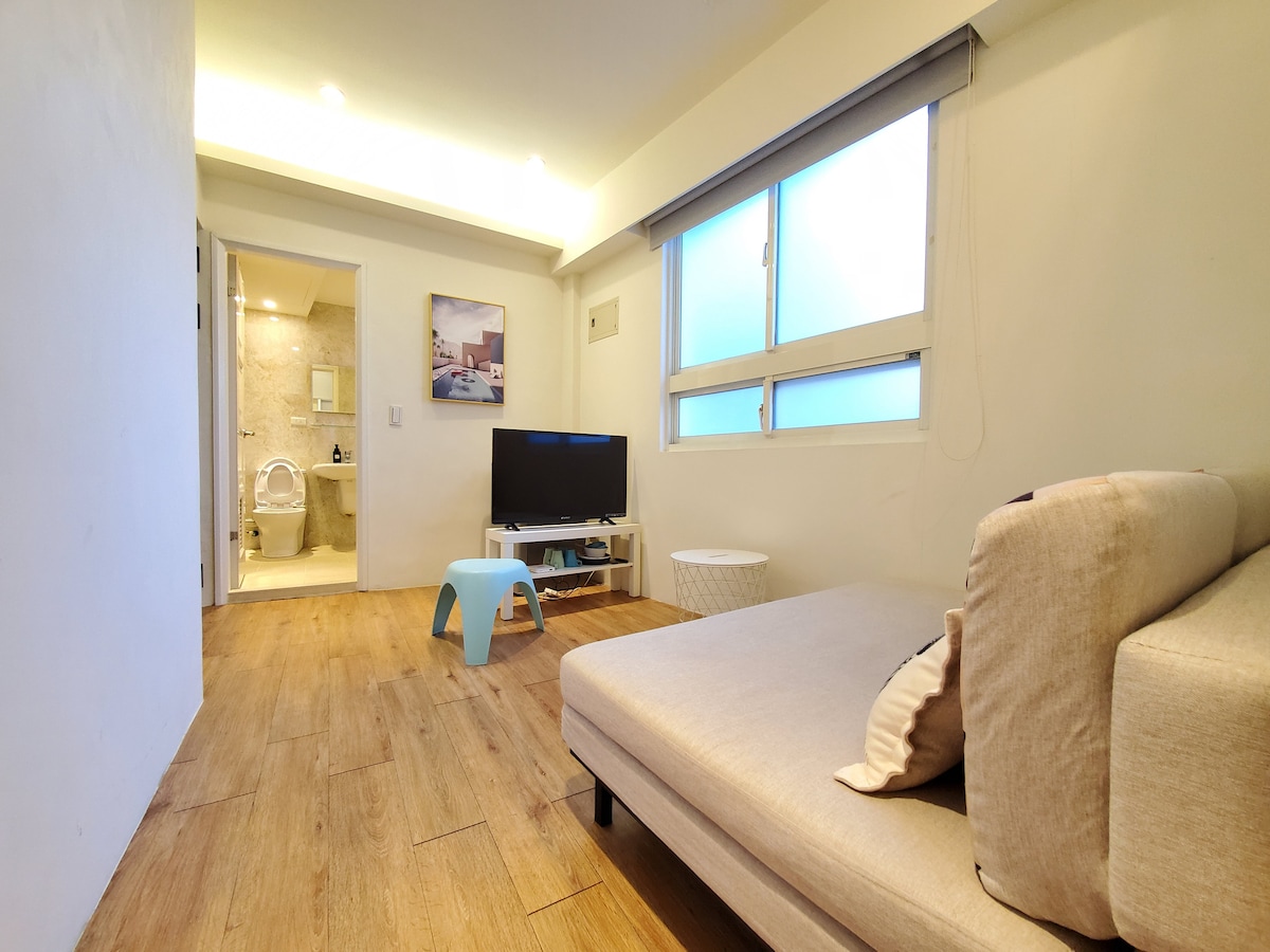 室內的灰白主色,配搭北美木紋銅色傢俱及家飾, 用心為您的居住空間提供沈靜優雅的感覺。日韓系電器的選用,不論是無線充電藍牙喇叭,大螢幕伸縮高清電視,都能滿足您對影音效果的要求。房源位於高樓內縮樓層,阻絕不必要的噪音並滿足您對景觀,安靜及隱私的要求。大樓並配有全天候警衛,住戶專屬電梯,公用大露台,以及地下收費停車場, 位處西門町核心路段,無論搭乘捷運或自駕都非常方便。Earth tone- based interior design offers warming, calm, healing and delighted atmosphere. Room facilities, including double bed, en- suite bathroom with shower enclosure, air conditioning, smart 4K TV with movies/Netflix, WIFI internet, cove lighting and music player with wireless connection & USB charger ports.