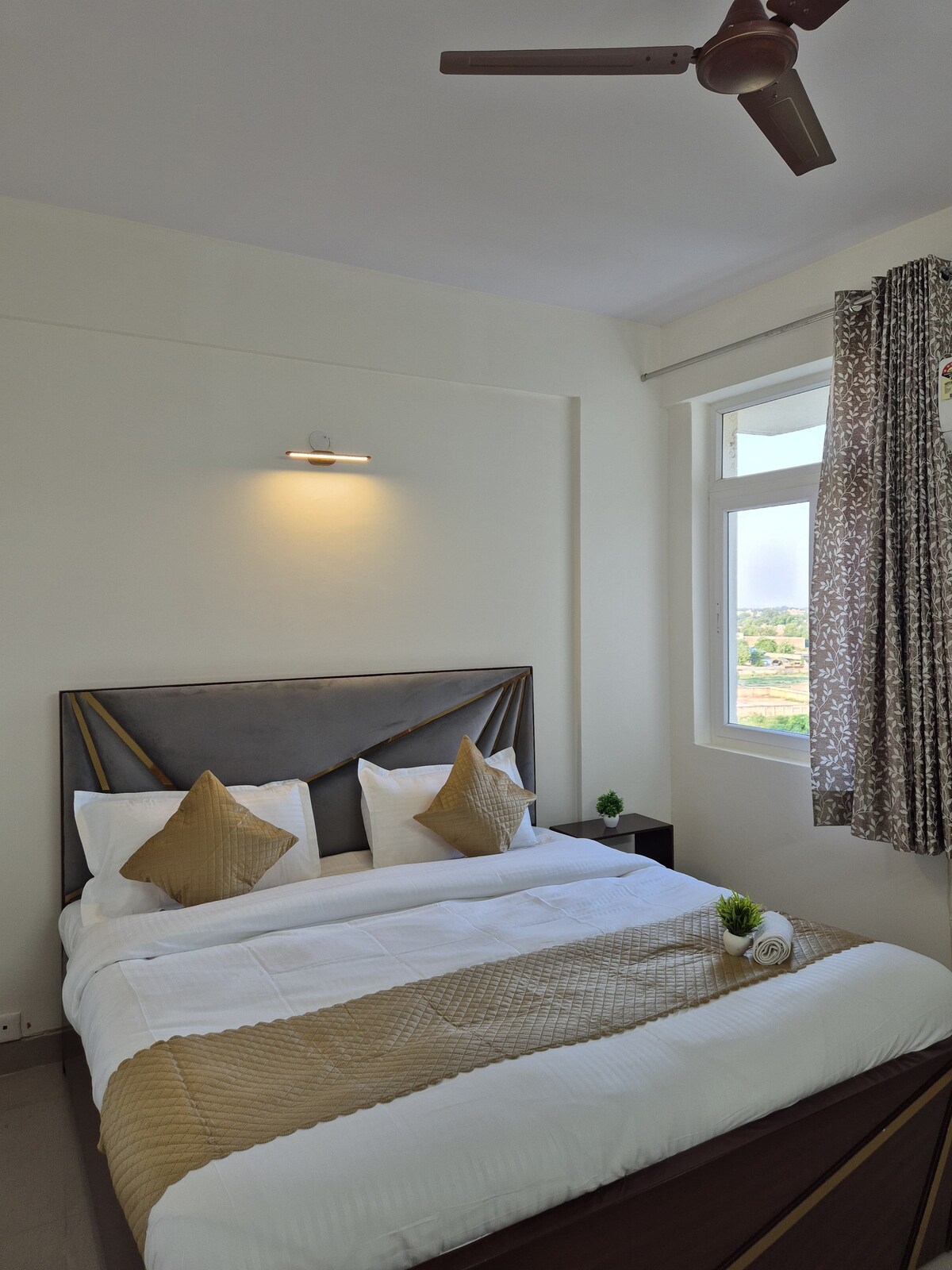 Welcome to Taj Luxuria by Red Olive, a luxury 3BHK apartment in Agra, located just 4 km from the Taj Mahal, ideal for families, group stays, and long stay travelers exploring the Golden Triangle. Situated in the peaceful gated community of Parsvnath Panchvati, this apartment comfortably hosts up to 6 guests with three fully air conditioned bedrooms with attached bathrooms, a bright living area, and a fully equipped kitchen.