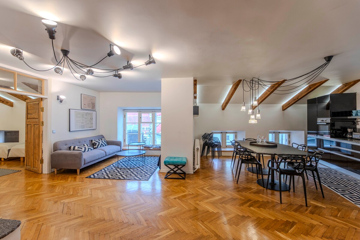 Klizite od spavaće sobe do saune, do otvorene terase u sofisticiranom stanu sa upečatljivim savremenim cvjetovima. Prozori se uzdižu do plafona visokog 5 metara, a kružna ogledala sjaje na svetlu. Parketni podovi i mekani tekstil dodaju dubinu i toplinu. Nekoliko minuta od Starog grada, potkrovlje je smješteno u elegantnoj stambenoj zgradi, odmah pored kreativnog centra Kultuurikatel. Istražite moderne, boemske četvrti Telliskivi i Kalamaja i jedinstveni Stari grad.