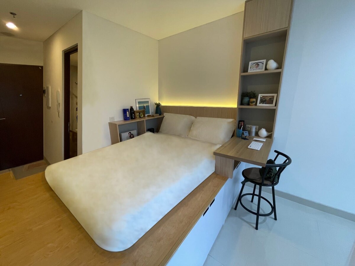 An elegant 24sqm studio in Jakarta's center, blending style and convenience. Includes kitchen, fast Wi-Fi, air-purification, 43" smart TV, sound system and Netflix. It is ideal for various stay types, with contactless access and amenities like pools, jacuzzi, gym, and basketball, Now features a Reverse Osmosis dispenser & food waste disposal, The picture shows a gas stove that has been replaced by an induction cooker (to follow the apartment guidelines for fire hazards)