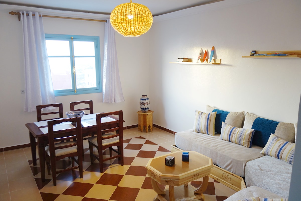 Un appartement calme et confortable pour les visiteurs de la région et les surfeurs, il vous offre tout le confort pour un séjour agréable, nous fournissons Internet haut débit, une cuisine entièrement équipée, une salle de bain chaleureuse et un parking sûr et gratuit. Pour les couples marocains, veuillez fournir le contrat de mariage tel que défini par la loi marocaine.