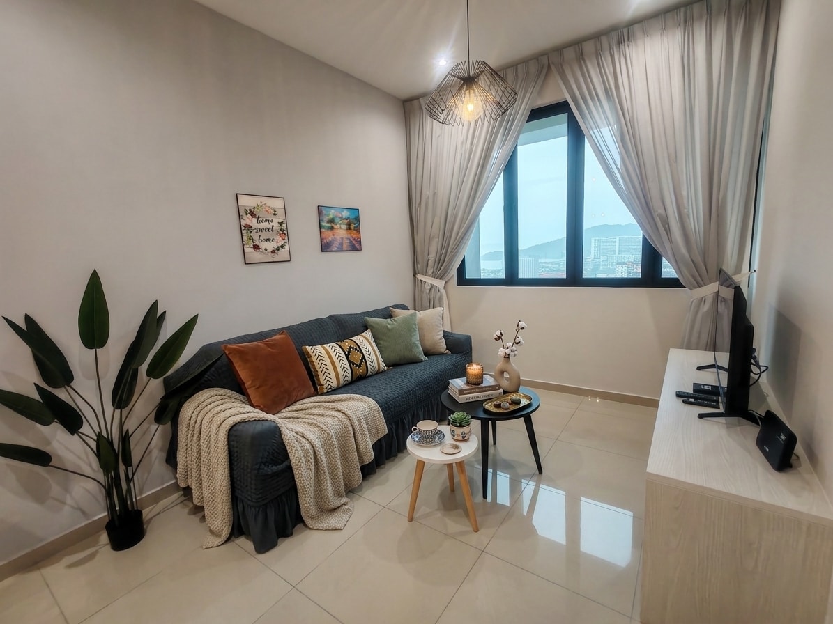Jazz Suites Penang Relax in this peaceful high-floor seaview unit at Jazz Suites Penang, Tanjung Tokong. Enjoy unobstructed sea views and beautiful sunsets in a cozy, clean, and comfortable space. The unit comes with self check-in, free parking, and access to pool & gym. Conveniently located near Gurney Drive, Straits Quay, Island Plaza, cafes, and local food spots — perfect for staycations or short getaways. Come experience a peaceful, cozy, and memorable stay by the sea in Penang.