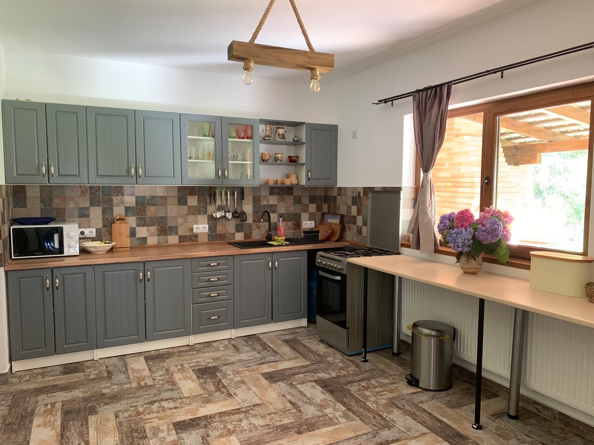 Kuća se u prizemlju sastoji od prostranog dnevnog boravka, spavaće sobe sa sopstvenim kupatilom, opremljene kuhinje, WC šolje, spoljne terase sa roštiljem i trpezarijom, kade sa grijanom vodom i hidromasažom(kada uz naknadu od 300 leja/jedan dan ili još 400 leja) Na spratu se nalaze 3 sobe sa bračnim krevetima i kupatilom, u 2 spavaće sobe su dodatni kreveti za jednu osobu i dušek na podu jedne od soba.