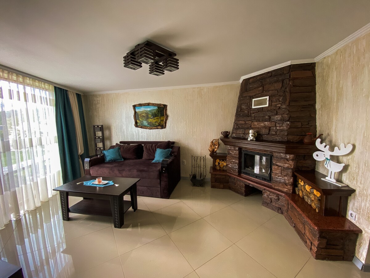 Opustite se u elegantnom domu sa cijelom porodicom i prijateljima. Barnhouse Tatariv is located in Tatariv village, 15 km from Bukovel, 26 km from Hoverla Mountain, 7 km from Khomiak Mountain. Kućni ljubimci su dozvoljeni uz dodatnu naknadu. Svaki bar ima potpuno opremljenu kuhinju, frižider, posuđe, električni šporet, mini-bar uz dodatnu naknadu, dnevnu sobu sa sklopivim kaučem, kamin, pametni TV, privatnu spavaću sobu sa velikim krevetom i garderobom, kupatilo. Porodica u ovom udobnom smještaju.