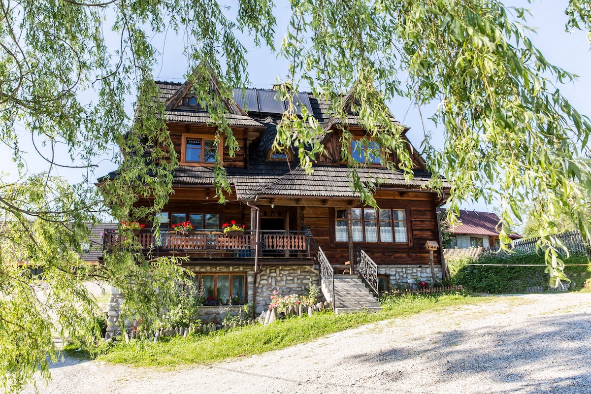 Stan na jednom spratu (100 m2) koji se nalazi u drvenoj kući na nadmorskoj visini od 1050!!! Ulaz je odvojen. Stan ima veliku terasu, obezbjeđujemo ležaljke. Pogled na planine „ulazi“ u dnevnu sobu:) Možete da parkirate automobil u sklopu objekta. Sauna i kamin su besplatni , a 2x hidromasažna kada ( drvena hidromasažna kada) se dodatno plaća. Do Gubałówke možete doći pješke(1 sat) i žičarom do Krupówkija (4 minuta). Okolina: pešačke i biciklističke staze, skijaške staze!