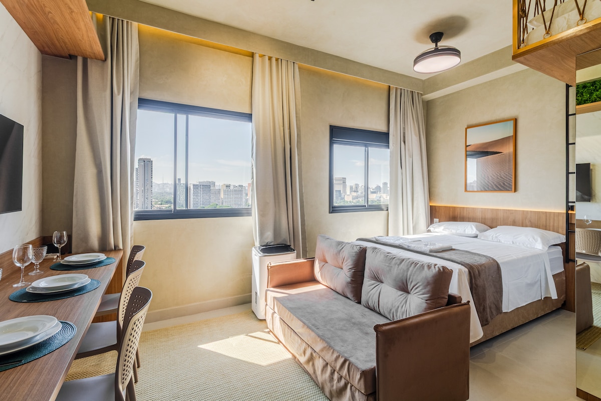 ATENÇÃO: Para utilizar o facility do estacionamento deve-se avisar com antecedência. Consulte a entrada do local nas fotos. Loft moderno bem decorado com vista urbana linda de São Paulo. Oferece cama Queen com pillowtop de 10 cm, TV de 50 polegadas, e ambiente iluminado pelo sol. A cozinha é equipada com utensílios de qualidade e inclui mesa de jantar e bancada de trabalho. O armário tem um bom espaço de armazenamento e o apartamento conta com ar-condicionado para conforto o ano todo.