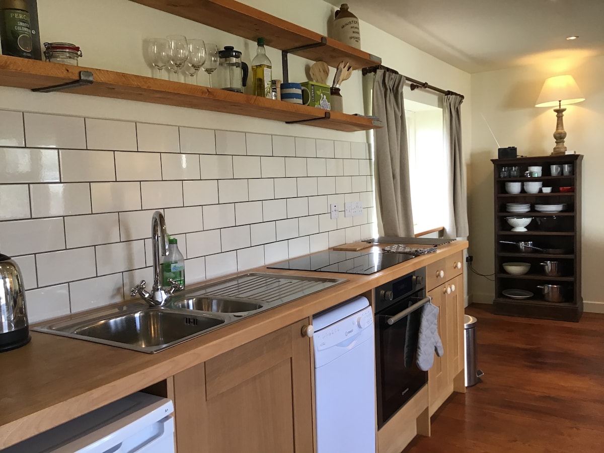 The Stables is in a beautiful peaceful part of Suffolk, on the River Deben, with footpaths, wild swimming, pubs within walking distance, birdwatching, views for artists, and fabulous lanes for cycling. Perfect for paddle boarders and kayaks too. The Stables have been converted into a cosy country cottage with contemporary furnishings, fitted kitchen, bedroom with super king bed, en suite bathroom, shower room, wood burner, 2 TVs and wifi, books and games, and tennis court (by arrangement).