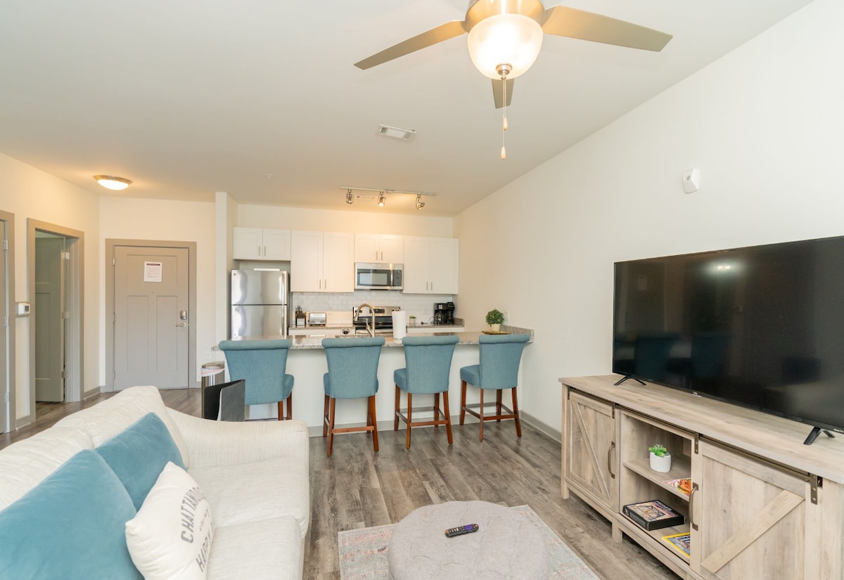 Prelepi Downtown Riverwalk Oasis STANOVAJ STAN je nova oaza u centru grada!!! Dizajniran i namješten kako bi našim gostima pružio moderno i luksuzno iskustvo, a istovremeno hvatajući utješan osjećaj koji možete dobiti samo od boravka u porodičnom domu. Sve što vam je potrebno u centru Čatanuge vam je na dohvat ruke. Akvarijum, šetnja rekom, restorani, barovi, park Kolidž i još mnogo toga su u krugu od nekoliko minuta. Takođe ćete imati pristup našem bazenu, teretani i klubu!!!
