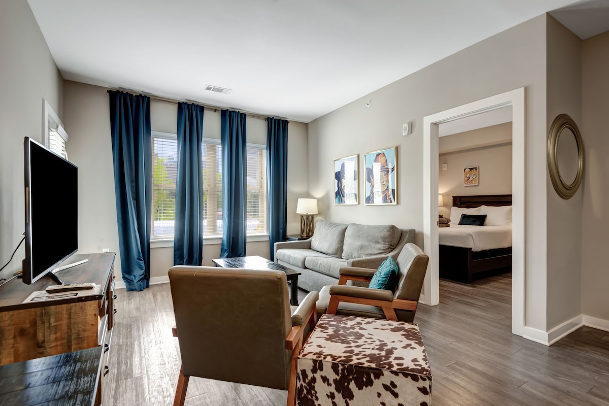 Ovaj prostrani stan od 1,134 kvadratnih metara, 2 spavaće sobe i 2 kupatila nalazi se u centru grada i potpuno je pristupačna za šetnju! Ovaj smeštaj je odličan za 2 para, grupe prijatelja ili porodicu koja želi da uživa u Nešvilu sa stilom! Jedinica je opremljena granitnim radnim površinama, potpuno modernom kuhinjom, drvenim podovima, izloženim zidovima od cigle i električnim roletnama na daljinsko upravljanje! Nema potrebe da iznajmite automobil ili da pozovete Uber ovde!