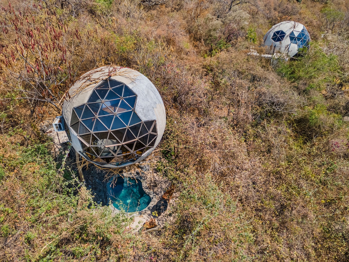 Geometrijska sferična brvnara sa privatnim bazenom.