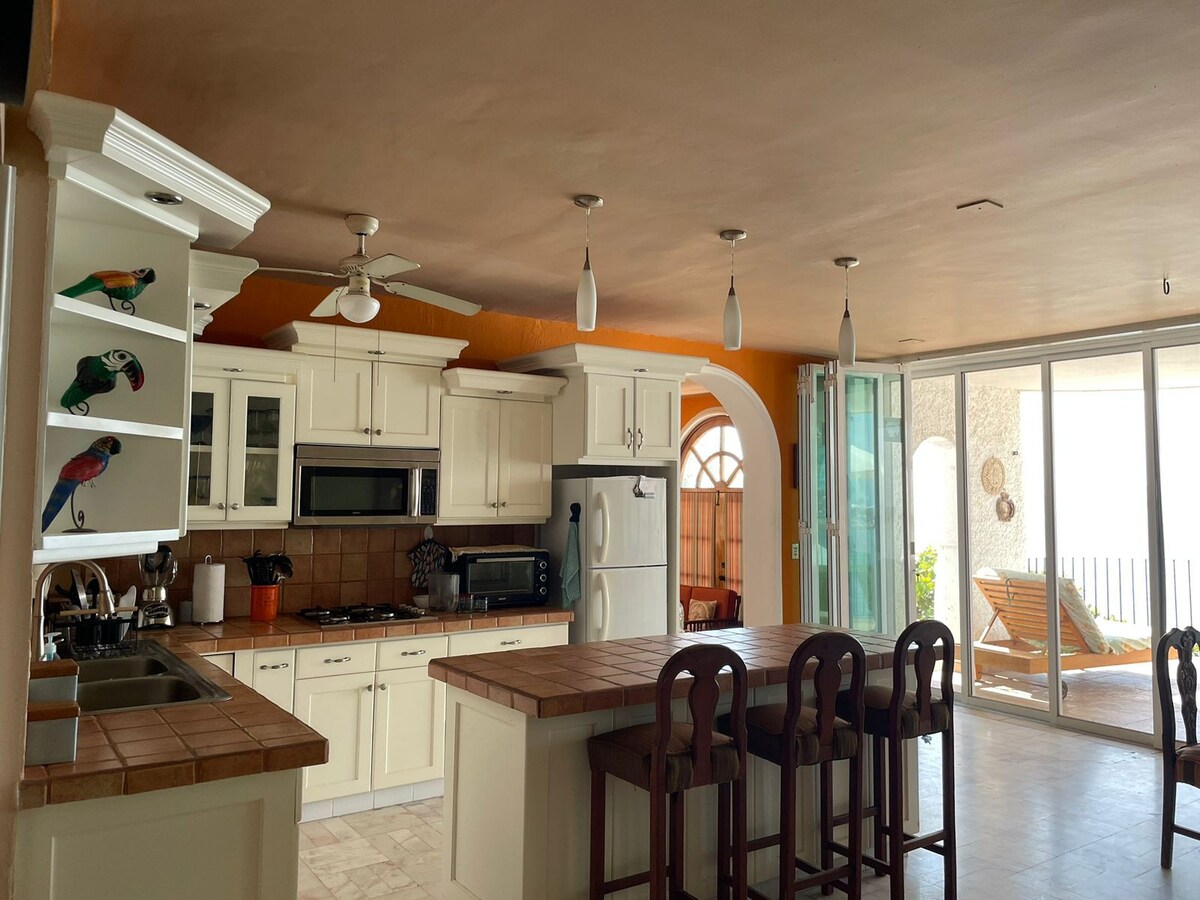 Amazing Home with spectacular views located on the Las Hadas Peninsula is the perfect spot for your family or group vacation. Large 2 story outdoor patio with heated plunge pool and built in grill . Ocean views thru out the home . 10 minute walk to Beach(Playa la Audiencia). Easy access to shopping Walmart, Sams Club, Starbucks and other Restaurants. 24 hour gated security. Public transportation(bus) runs in front of condo entrance. Pet friendly, we accept small dogs and cats.