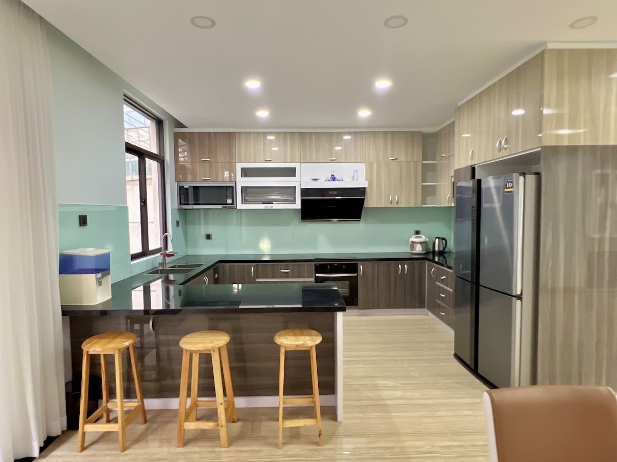 Moderna kuća luksuznog dizajna u delikatnim belim i plavim tonovima, potpuno opremljena: kuhinja, rerna, frižider, televizor, mašina za pranje veša, mašina za sušenje veša, kauč, dvorište za sušenje veša... Prostran, čist prostor, stvara osećaj opuštenosti i udobnosti. Odlična lokacija u srcu Da Nanga, 3 km od aerodroma, 2 km od železničke stanice, više od 2 km od centralne autobuske stanice, skoro 2 km od plaže Tan Ke, skoro 4 km od Zmajevog mosta, pored supermarketa... Pogodno za velike porodice i grupe prijatelja koji žele da dožive divan odmor.