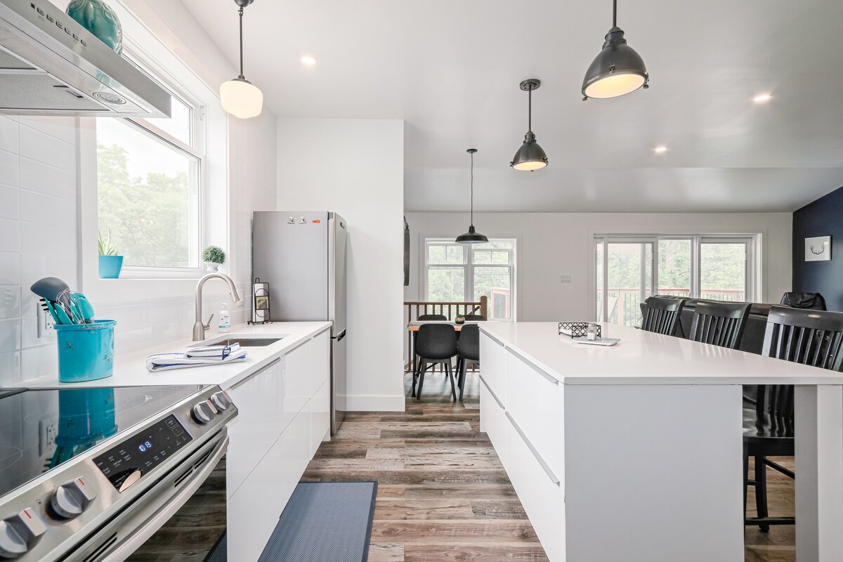 Kick back and relax in this calm, stylish space, surrounded by bright light, wooded forest, a pond with a fountain and garden views. Sit back and enjoy a cup of coffee or wine on our large deck overlooking the forest while enjoying the sounds of the birds. If you like being outdoors there is a firepit to enjoy with that glass of wine! We now have a dedicated space for a firepit patio, outdoor sauna and a hammock(seasonal)!