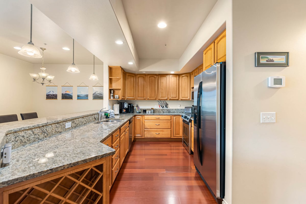 Experience the comfort of a modern space nestled in the mountains! Two Pines on Main Street is a recently updated 2 bed/2 bath condo in Leavenworth furnished for the modern traveler. This elevator-accessible 3rd floor unit features a spacious balcony overlooking the Cascades, a dedicated indoor parking spot, a stocked kitchen, 1GB internet access, comfortable bedrooms, and full-size bathrooms. Located in downtown Leavenworth, you'll literally be steps from Front Street AND from Enchantment Park.