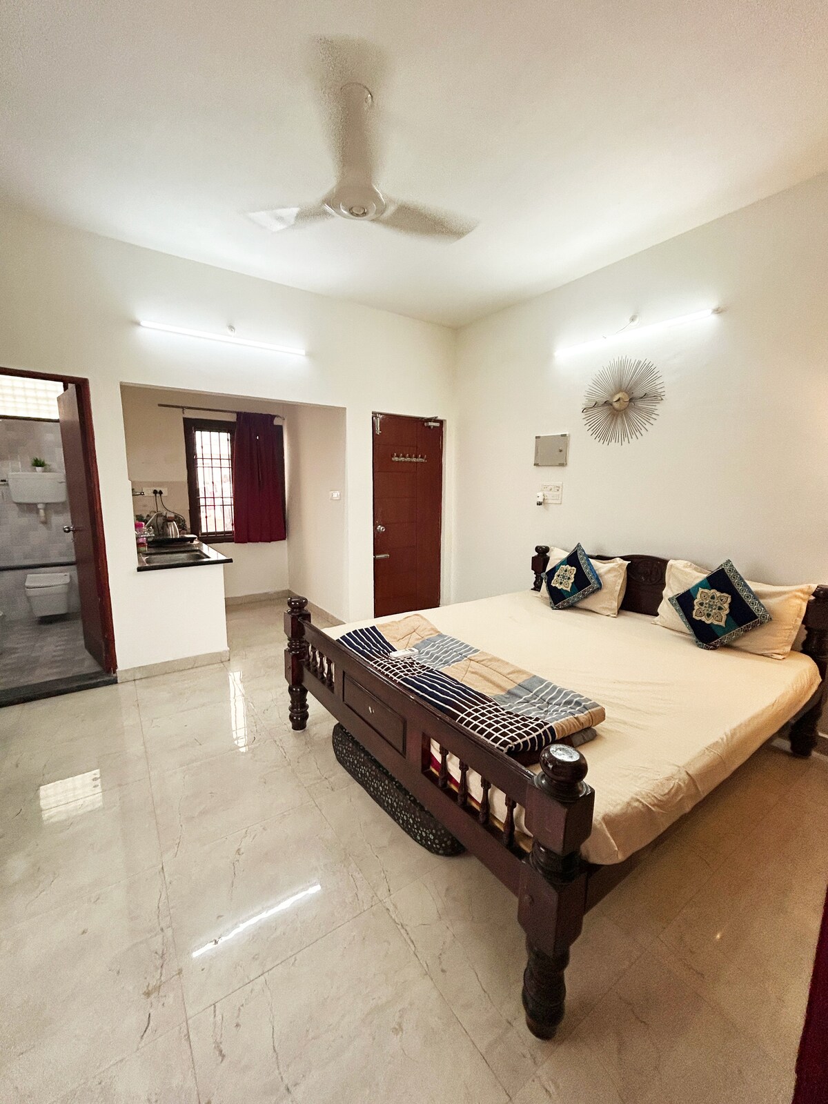 Vaš dom u Aurovilu je ukusno uređen u Četinadskoj temi. Svaki ugao našeg doma je Instagramworth sa šarenim enterijerom, kolam umetnošću, antiknim dekorom i još mnogo toga. 1BHK može udobno da ugosti 4 osobe sa ljuljačkom i kaučem u dnevnoj sobi. Hile ima mnogo restorana u blizini, naša kuhinja je pažljivo opremljena za sve vaše potrebe - bilo da se radi o brzom omletu ili punom indijskom obroku. Zato se opustite i pijuckajte kafu.