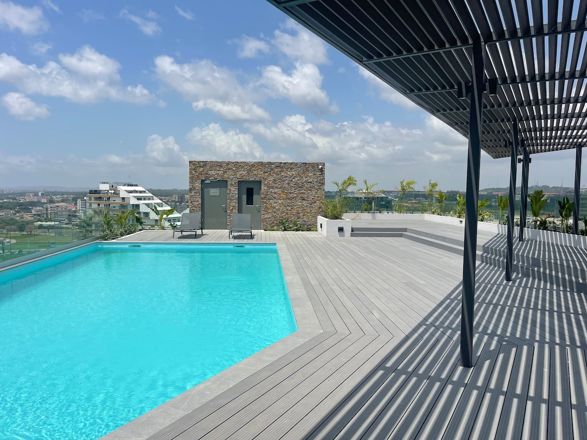 Doživite čisti luksuz u The Haven, Loxwood House – modernom dvosobnom apartmanu sa panoramskim pogledom na grad, infiniti bazenima na krovu, teretanom i restoranom u sklopu objekta. Karakteristike uključuju prozore od poda do plafona, Smart TV, brzi Wi-Fi, potpuno opremljenu kuhinju i balkon. Uživajte u bezbednosti 24/7, zelenim površinama i bezbednom parkingu. 7 minuta od aerodroma Kotoka i 3 minuta do tržnog centra Akra, savršeno za poslovne putnike, turiste ili digitalne nomade koji traže udobnost, privatnost i eleganciju inspirisanu Ganom.