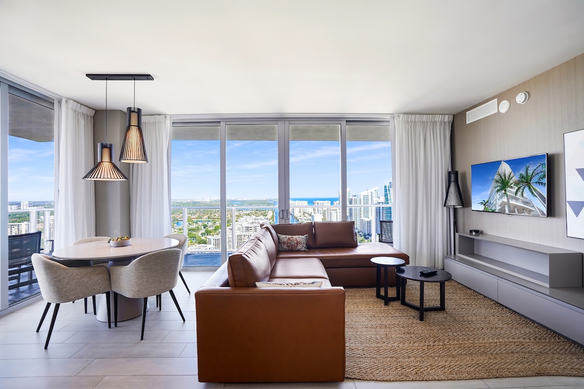 „Otkrijte visoku sreću na 33. spratu sa zadivljujućim okeanom i pogledom na obalu. Smješten između mirnih vodenih puteva i atlantskih plaža, ovaj elegantni potpuno opremljen stan nudi porodičnu zabavu, odmor s prijateljima ili romantična utočišta. Nekoliko minuta od tržnog centra Aventura, prodavnica u luci Bal Harbour i parka Gulfstream. Uživajte u uslugama na plaži, teretani, bazenima, hidromasažnoj kadi i sportskim sadržajima. Vaše sveobuhvatno odredište za odmor, luksuz i smijeh, prilagođeno svakoj prilici.”