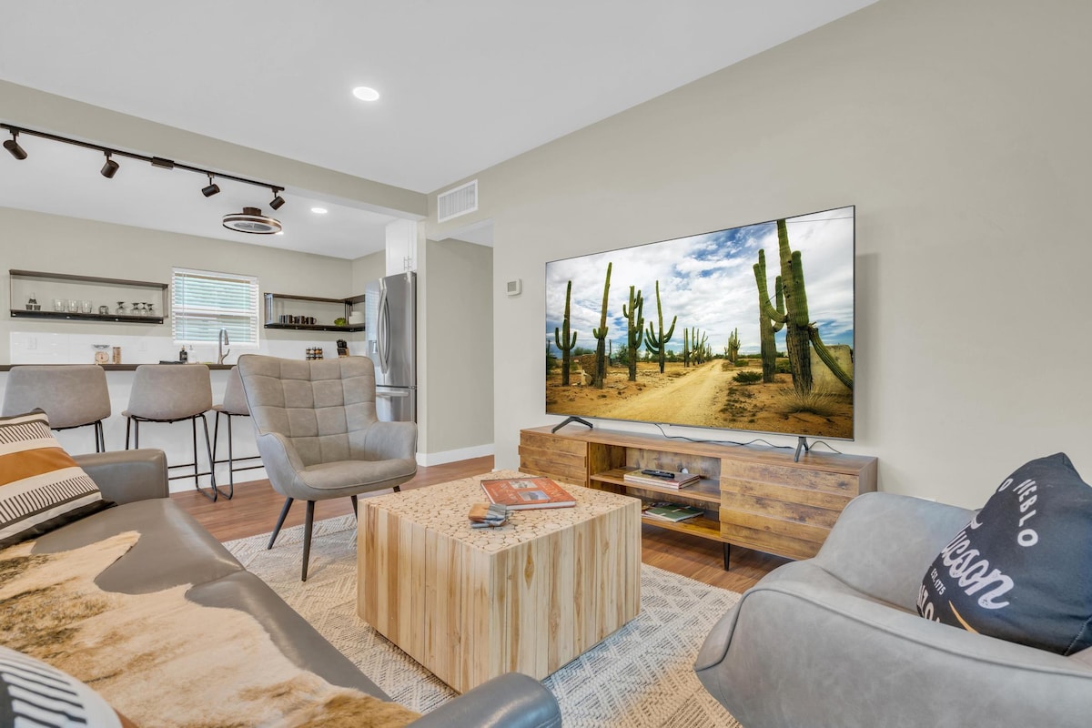 Doživite živopisno srce Tusona u našem prelijepo renoviranom domu - vašem savršenom utočištu u Starom Pueblu. Uživajte u prostranim nadsvođenim plafonima i posebnom kancelarijskom kutku koji je idealan za rad na daljinu ili razmjenu imejlova. Prošetajte do lokalnih favorita, kao što su kulinarski odlazak ili Prep i peciva, ili se kratko provozajte i istražite Nacionalni park Saguaro. Praktično parkiranje izvan ulice neposredno ispred smještaja sa non-stop nadzorom video kamere. praktično u kućnoj mašini za pranje/sušenje veša i potpuno opremljenoj kuhinji.