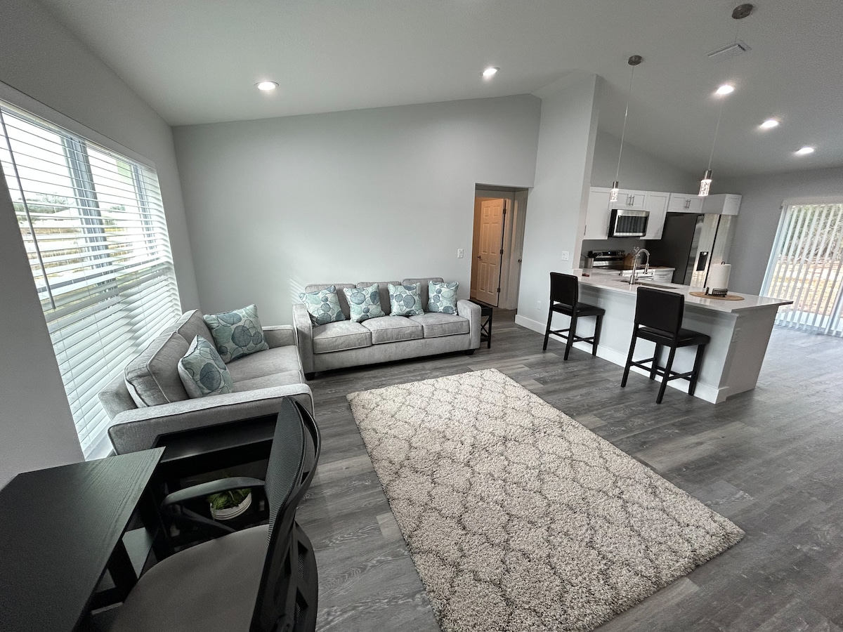 Welcome to Casitas Home Collection, a brand-new 3-bedroom, 2-bath home in Ocala, Florida. Everything inside is new, offering a clean, modern stay. Enjoy a dedicated desk with high-speed internet, a fully equipped kitchen, BBQ grill, private patio, and garage parking. Located in a quiet neighborhood near shopping, dining, and the World Equestrian Center (WEC), 30 minutes from Rainbow River, 1 hour from Silver Glen Springs, and 1 hour from Walt Disney World. A perfect place to feel at home.
