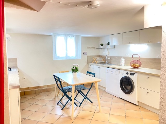 Appartement 35 m² au 1er étage . Non fumeur ! A 5 minutes du Théâtre . lit électrique 1m40 sur 1m90 petite chambre . petite salle de bain Avec petit évier ,douche et WC dans petite pièce ! Cuisine avec café, beurre confiture eau fraîche thé offerts avec modération !! lave linge et lave-vaisselle . Possibilité de faire la cuisine . idéal pour une personne ou un couple de passage théâtre qui et a même pas à 5 minutes de l'appartement