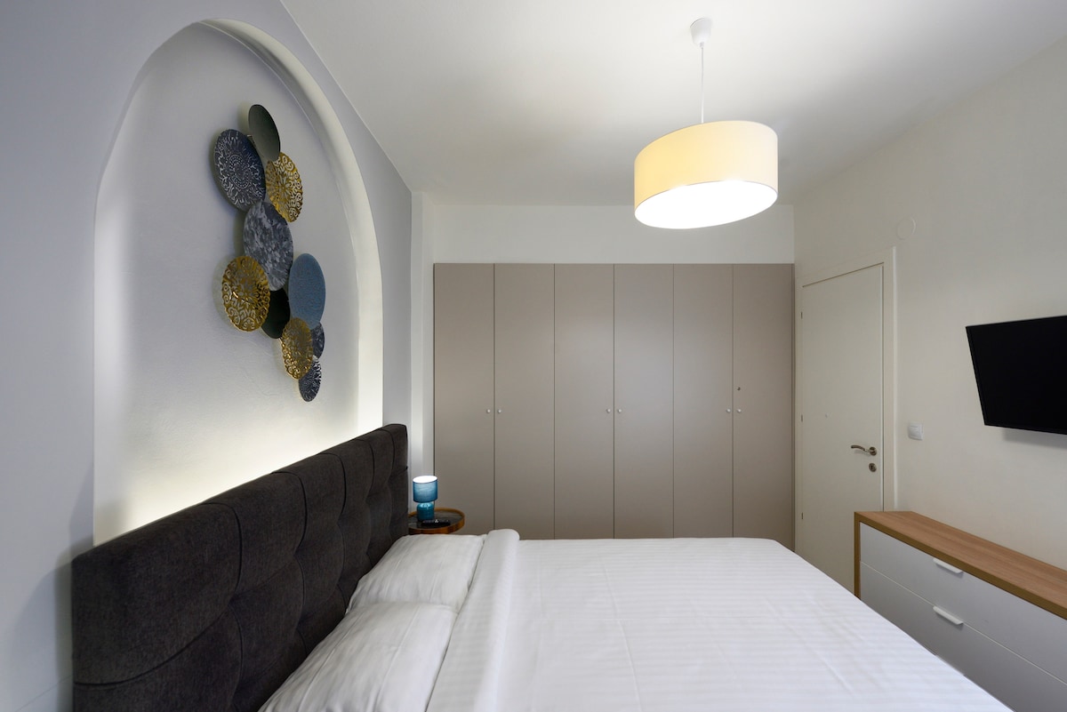 Uživajte u privatnosti i eleganciji luksuznog, moderno dizajniranog, potpuno opremljenog stana pored Aristotelskog trga. Potpuno renoviran sa vrhunskim nameštajem i potrepštinama, opremljen TV-om i Netflix-om. Miran, sunčan apartman koji se nalazi na 5. spratu u samom srcu živopisnog istorijskog centra, sa prodavnicama, restoranima i kafićima udaljenim samo minut! Uživajte u pogledu na more sa prelepog balkona ili uživajte u šetnji duž obale koja je odmah iza ugla!