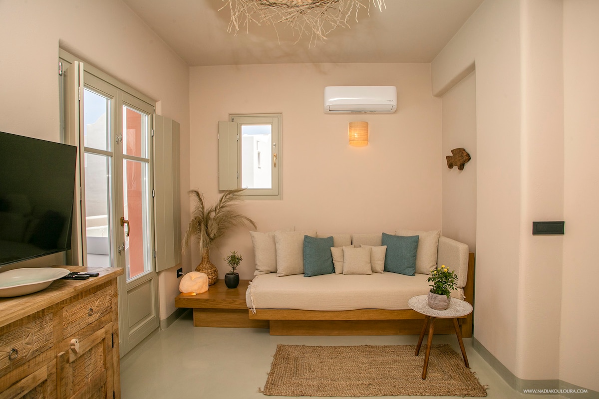 Nedavno renoviran kikladski studio smešten direktno na plaži Agia Paraskevi. Uživajte u mirnom, privatnom odmoru daleko od buke, a samo 10–15 minuta hoda od živopisnih restorana i prodavnica u Kamariju. Ovaj elegantni dom kombinuje tradicionalni stil sa modernom udobnošću, nudeći neposredan pristup plaži i vrhunske sadržaje. Savršeno za one koji traže mir i umirujući zvuk Egejskog mora. Doživite najbolje od Santorinija živeći na plaži u mirnom i sofisticiranom okruženju.