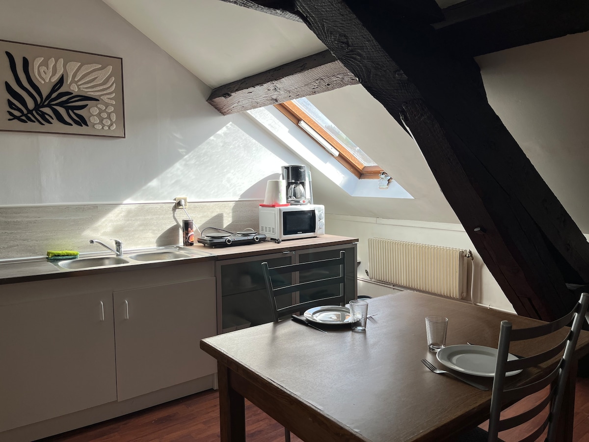 Stan na spratu u nameštenom ambaru sa pogledom na unutrašnji bazen sa grejanjem i privatno iznajmljivanje. Bazen je veličine 7m50 X 4m, ima ravno dno sa dubinom od 1m45. Prostor za opuštanje sa stonim fudbalom i kaučem na razvlačenje koji se nalazi pored stana. Potpuno opremljena kuhinja sa aparatom za kafu Dolce. Terasa je namještena. Kućni ljubimci nisu dozvoljeni