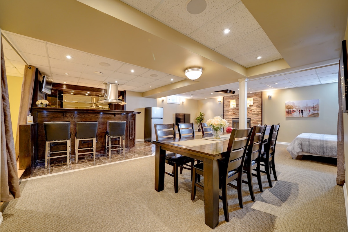 Dobro došli u naš moderni potpuno novi 2BR, 2BA podrum u Ričmond Hilu! Idealan za porodice ili grupe, može se pohvaliti elegantnim životnim prostorom, prostorom za pranje veša i dobro opremljenom čajnom kuhinjom. Glavna spavaća soba ima kamin i kupatilo, dok obje spavaće sobe nude bračne krevete i dovoljno prostora za odlaganje. Zabava je opremljena TV-om i Wi-Fi-Netflix-om i Amazon Prime-om,u luksuznoj četvrti, na samo 5 minuta hoda do ulice Jonge i autobuske stanice radi lakšeg pristupa . Doživite udobnost i praktičnost