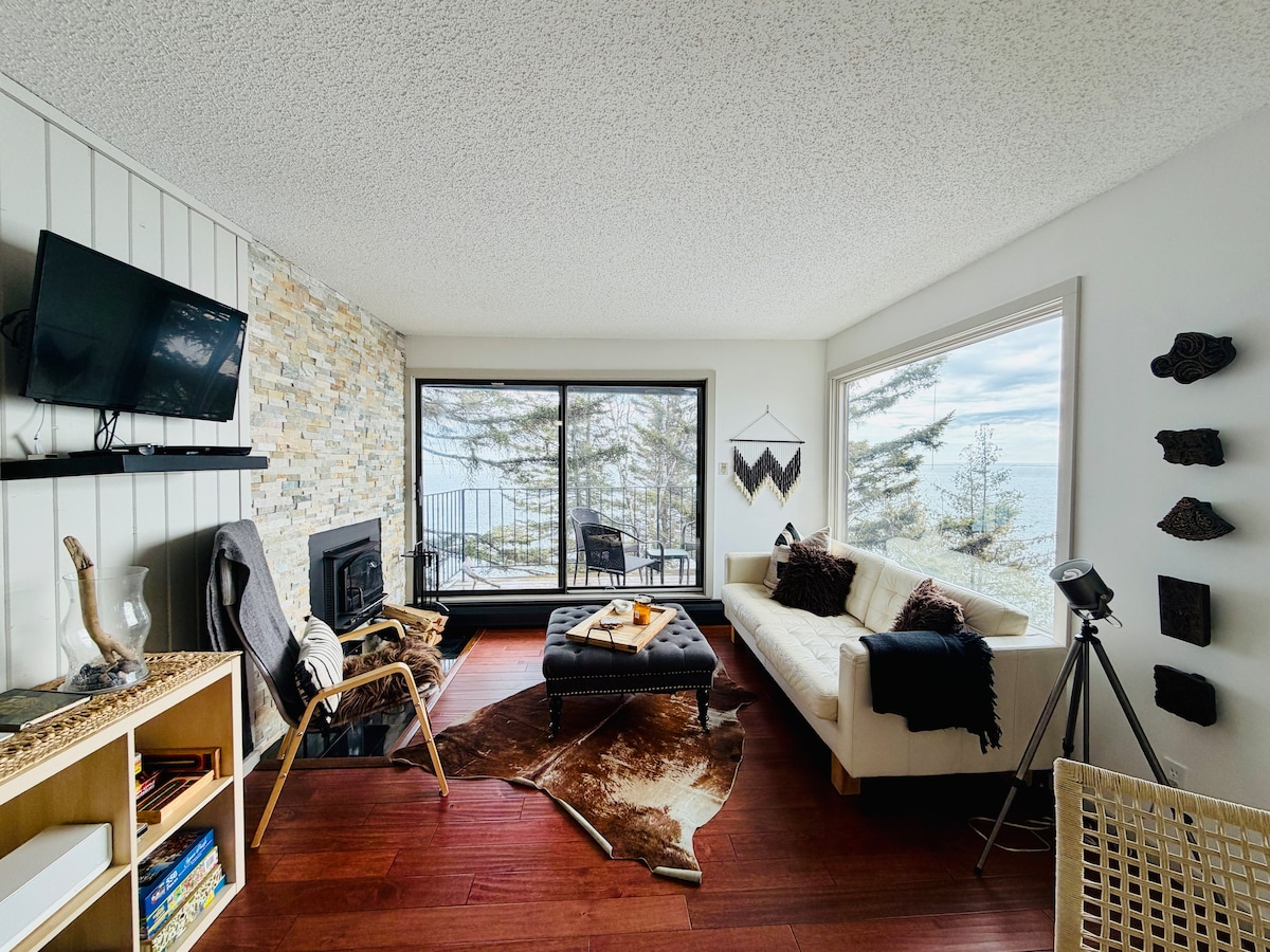Sunčani stan na prvom spratu koji se nalazi visoko na stjenovitim liticama s pogledom na jezero Supi - samo nekoliko koraka do ivice vode. Privatna završna jedinica nudi prozore sa 2 strane sa zadivljujućim pogledom i stereoličnom simfonijom zvukova jezera i susednog potoka. Pažljivo odabrana kolekcija antikviteta, starinskog i modernog namještaja i kolekcionarskih predmeta sa modernim pogodnostima. Opustite se na privatnom dvorištu ili duž obale. Jednostavan pristup planinarskim, biciklističkim i skijaškim stazama, odličnim restoranima, planinama Lutsen, vinariji i još mnogo toga.