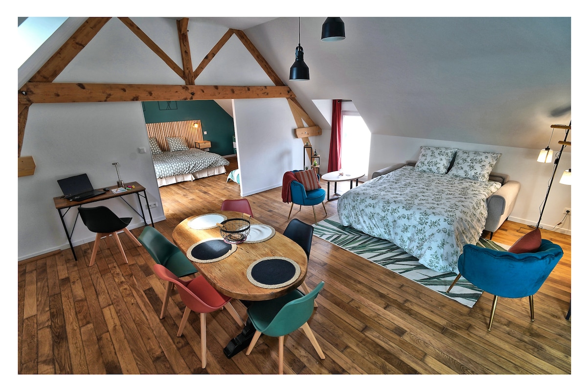 1 Appartement, classé 3⭐️, d'environ 80m² offrant : une entrée indépendante, où vous pourrez y déposer manteaux et chaussures. A l'étage vous y trouverez un grand espace de vie avec salon (canapé lit) et une salle à manger, un coin bureau, une cuisine équipée . Une salle de bain avec douche à l'italienne, vasque et machine à laver. Des serviettes vous y attendront. Une grande chambre avec un lit de 180cm (divisible en 2 lits de 90) et un lit d'appoint complètent l'appartement.