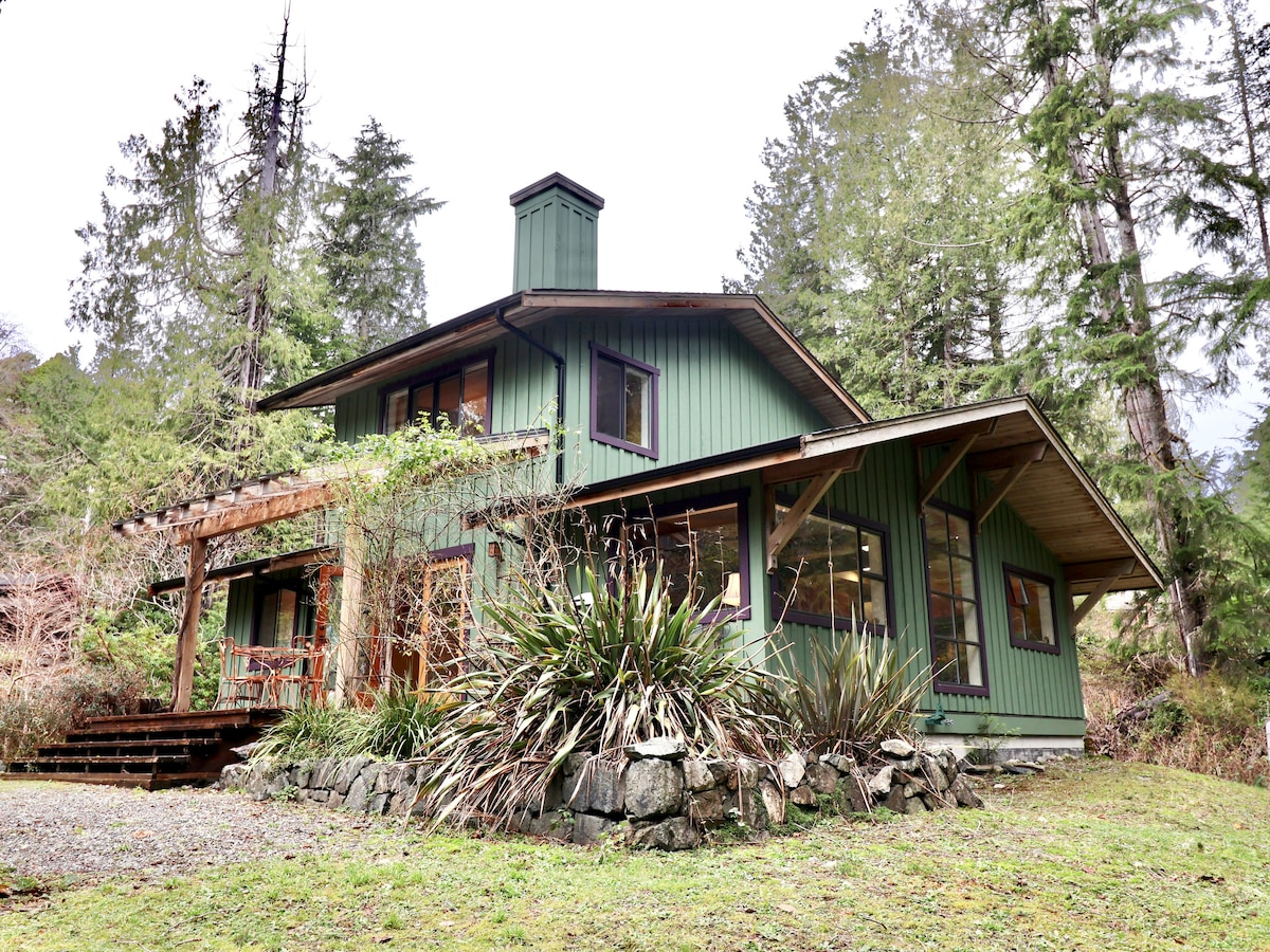 Ova prelijepa ručno izrađena kuća u Kobu je sama po sebi potpuno nezaboravna avantura. - Ceo dom je samo za vas, veoma privatan. - Okružen prašumom, kao da ste u kući vila! - Kreativno napravljen od lokalnih, prirodnih i recikliranih materijala. - Peek-a-boo Inlet pogled - Rustikalno okruženje, prelijepa staza, bašte, besplatni lutajući pilići u dvorištu... - Parking je besplatan, udaljen samo 3 minuta vožnje od grada Ucluelet - U blizini su beskrajne aktivnosti i mesta za istraživanje! * Nalazi se u Surf Shacks volumenu 2