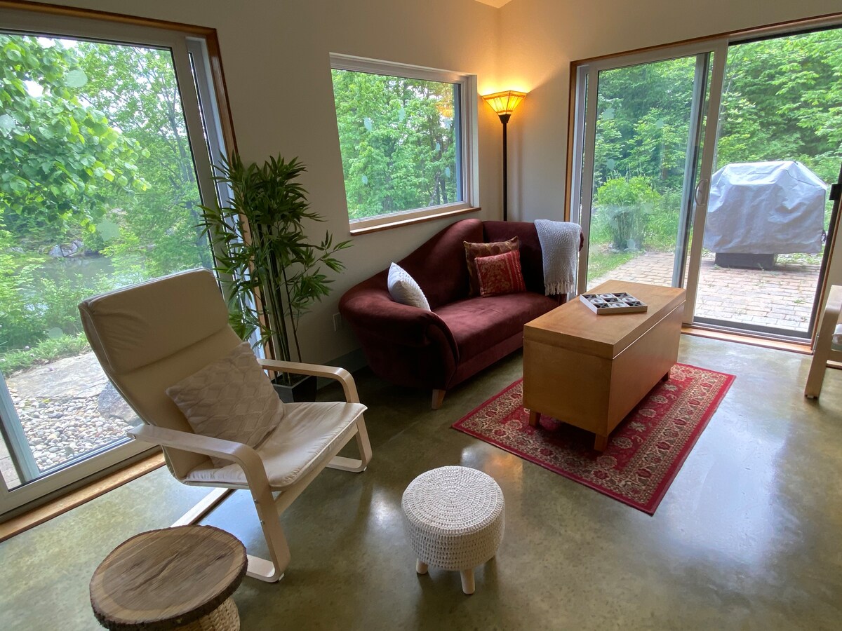 Odmor na našem elegantnom i otvorenom konceptu airbnb-a samo nekoliko koraka od reke Rideau. Naš Airbnb se može pohvaliti pogledom na Rideau brave sa prednje strane i našu imovinu od 6 hektara sa zadnje strane. Uzmite naš kanu ili daske za veslanje na reci, uživajte u logorskoj vatri pod zvezdama, pešačite obližnjim stazama ili istražujte obližnji grad Merikvil. Uživajte u svom privatnom dvorištu sa trpezarijskim stolom, roštiljem i puno privatnosti.