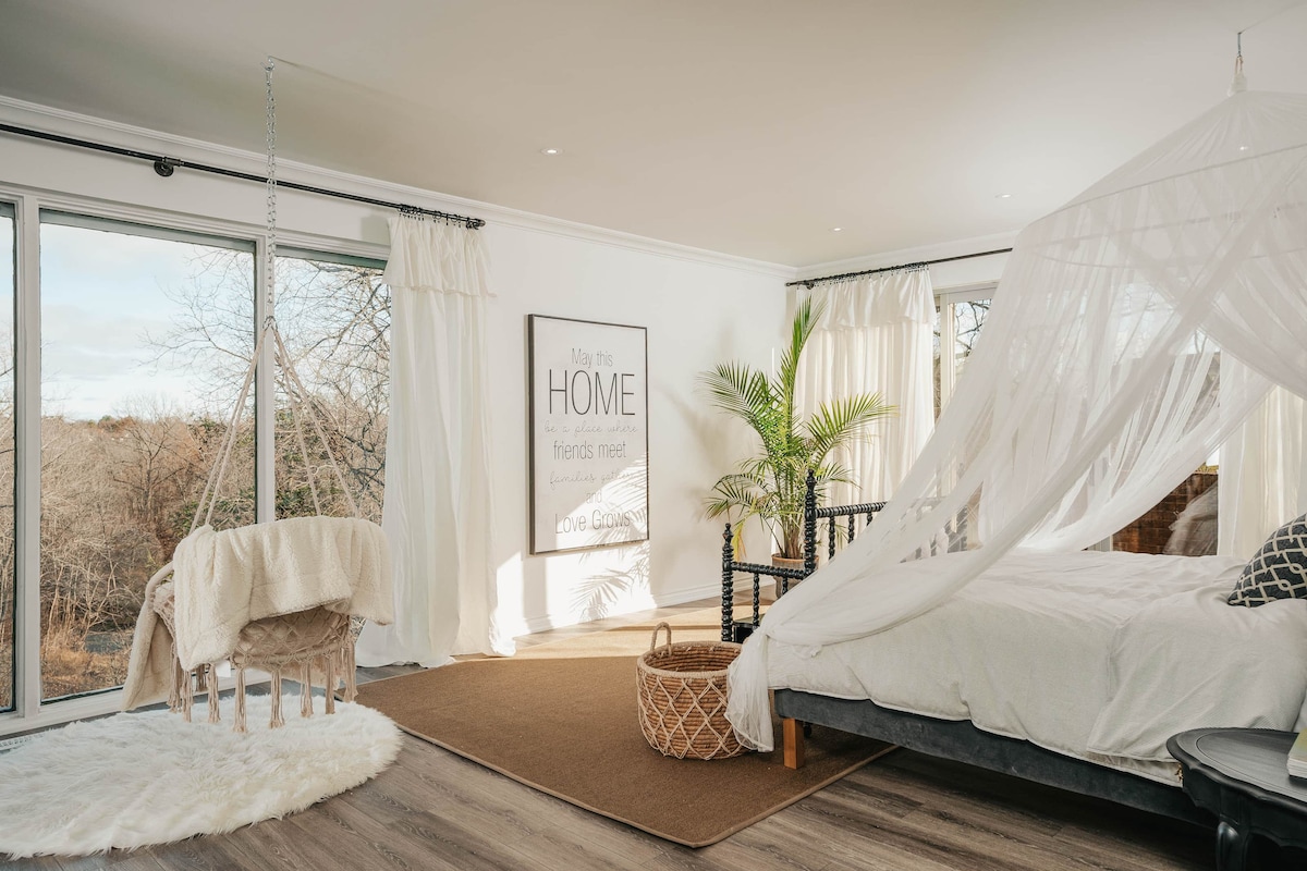 Zakoračite u stil i udobnost u ovom pažljivo uređenom smještaju, gdje se kanadska avangardna umjetnost susreće s bezvremenskim antikvitetima i modernim sadržajima. Uživajte u mirnoj spavaćoj sobi s plišanim bračnim krevetom, dva luksuzna kauča ispunjena perjem, kuhinjom spremnom za kuvare, ogromnim dizajnerskim trpezarijskim stolom od prirodnog kamena, kancelarijskim prostorom, zen kupatilom, kompletnim vešom, terasom obasjanom suncem i bujnom oazom u dvorištu. Idealno za profinjene gradske odmore ili opuštajući odmor. Privatni parking je uključen radi lakšeg snalaženja.