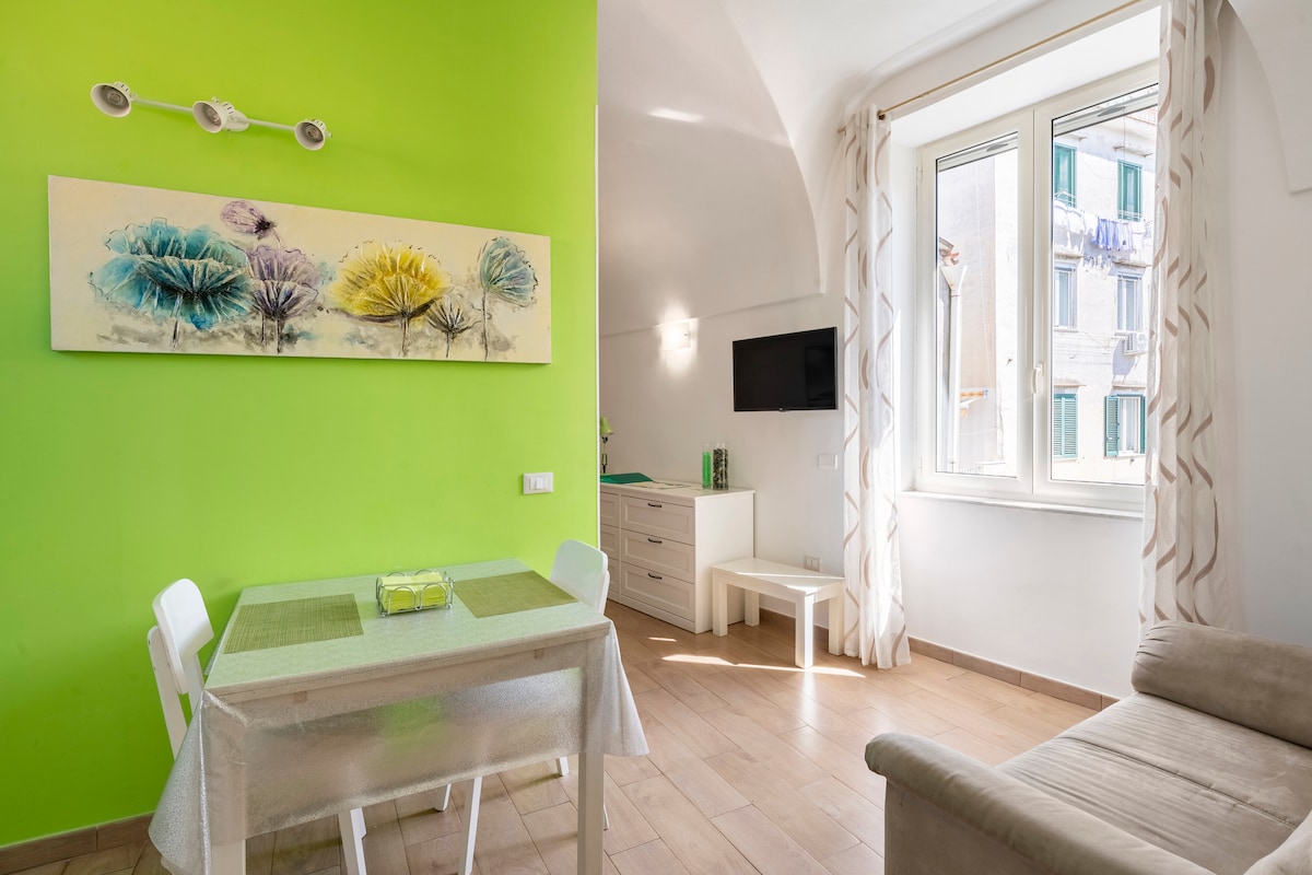 Luksuzni stan: kombinacija klasične elegancije i modernosti, upravo renoviran sa ĐAKUZIJEM i PRIVATNIM KROVOM od 90 m2 gdje se možete diviti vulkanu Vezuv. Smještena u istorijskoj zgradi na 3. spratu bez lifta u srcu starog grada, do svega možete doći pješke. Besplatan Wi-Fi, PrimeVideo, Nespresso i skladište za prtljag Zanimljiva mjesta • 2 min Duomo • 4 minuta podzemne željeznice u Napulju • 6 min Metro L1 & L2 • Željeznička stanica u trajanju od 5 minuta • Luka u trajanju od 10 minuta