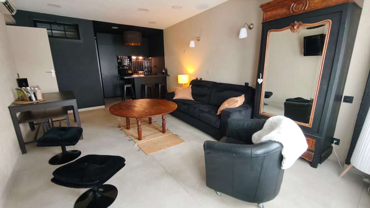 Profitez d'un logement élégant et central. Au calme, à deux pas de la gare et du centre ville. Proche des commerces, Marques Avenue et du centre historique. Ancien atelier de menuiserie entièrement rénové avec terrasse agréable. Cuisine équipée, smart TV, wifi, clim réversible, 1 chambre en mezzanine avec un lit double + 2 lits simples pouvant être transformés en lit double. Salle de douche avec douche à l'italienne. 1 wc à chaque niveau.
