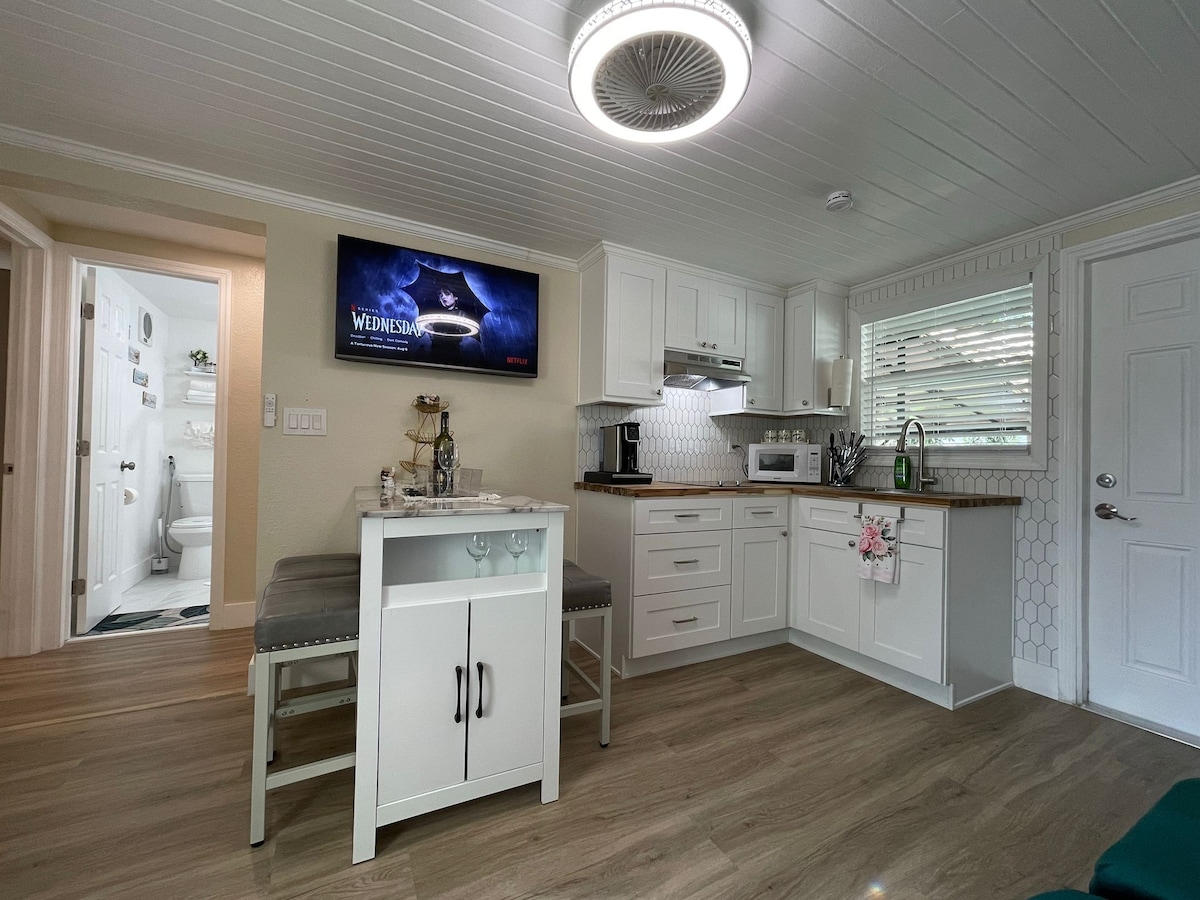 Uživajte u našem udobnom apartmanu za goste u dvorištu. Potpuno ograđen ogradom za privatnost sa posebnim parkingom van ulice. Naš prostor je pješačka udaljenost do nekih od najboljih barova, kafića i restorana u Seminole Heights. Unutra ćete imati potpuno opremljenu čajnu kuhinju, vrlo udoban potpuno novi bračni krevet, Smart TV i brzi internet. Imamo sve što vam je potrebno da obezbedite udoban boravak za odmor ili poslovna putovanja u samom centru grada sa brzim pristupom svemu putem automobila.