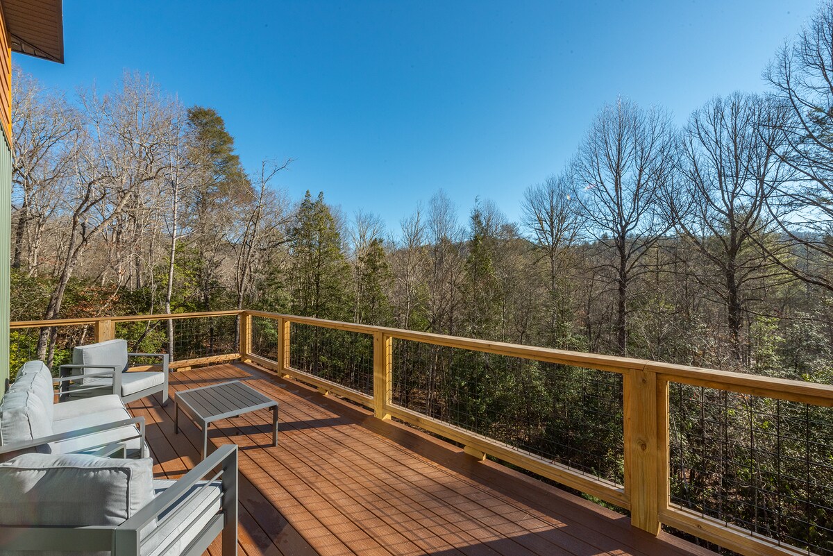 Newly added (not pictured)-Playset, EV Charger, Sauna, 98”TV & outdoor furniture! Private sanctuary on 13 Acres offers breathtaking PANORAMIC VIEWS 🌄 Scenery Mountain-facing hot-tub w/ stunning sunsets! 🔥 Cozy Luxury Unwind beside the stone fireplace or the wood-stove facing Mountain Views! Or around the outdoor fire pit! 🎮 Entertainment The full gameroom with a 98” TV! 🌿 Nature Peaceful seclusion just minutes from Brevard, NC New Additions: Level 2 EV Charger, Sauna, Playset, & More!