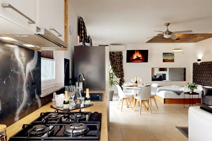 Romantično utočište za opuštanje u srcu prirode. Savršeno za parove i one koji su na medenom mesecu, a traže privatnost, mir i privatnu hidromasažnu kadu sa saunom u buretu. ✨ Šta će vam se svidjeti: • Dve privatne terase za opuštanje pod zvezdama • Privatna finska sauna u buretu • Hidromasažna kada na otvorenom je dostupna tokom cele godine • Udoban dnevni boravak i potpuno opremljena kuhinja Savršeno za proslavu ljubavi, opuštanje u privatnosti ili istraživanje Slovenije danju i opuštanje noću.