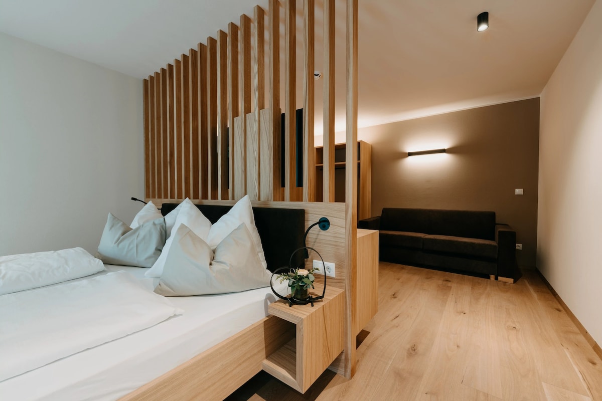 Room Murrer Doppelzimmer 105 in Sarntal offers 25 sqm of space for up to 2 guests. You have 1 bedroom and 1 bathroom during your stay. Private amenities include high-speed WiFi suitable for video calls, television, balcony with mountain view, breakfast, dedicated workspace, and elevator access. The room features step-free access and step-free interior for your convenience. At Murrerhof in Sarntal, unwind in the shared sauna and stylish wellness area.
