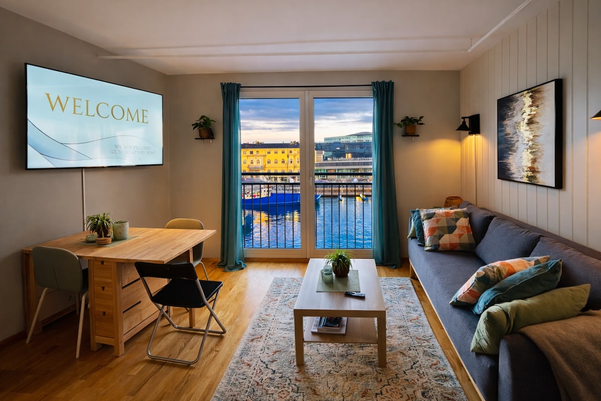 Jedinstven, odličan, svijetao i prostran dvosoban stan, u centru grada, na rubu mola na Solsidenu, Elvehavn Brygge, s pogledom na rijeku Nidelvu, bazen Rozenborg s marinom. Privatni natkriveni balkon od 10 m2 odmah iznad ivice pristaništa gdje možete uživati u suncu, zalasku sunca i životu napolju. Stan se nalazi u neposrednoj blizini živahnog Solsidena sa restoranima, kafićima, barovima i tržnim centrom. Kratka šetnja do centra grada i svega što želite od znamenitosti za boravak u Trondhajmu.