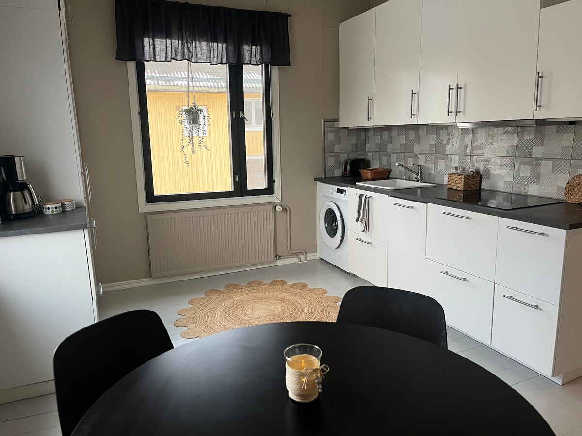 Nauti virkistävästä majoittumisesta tässä viihtyisässä, tyylikkäässä ja hyvin varustellussa kaksiossa, jossa on parveke ja sauna. Keskustan palvelut ja juna-asema 10 min kävelymatkan päässä. Upeat merenrannan kävely- ja lenkkeilyreitit alkavat talon läeisyydestä. Kaksi hiekkapohjaista uimarantaa 1 km käveyn päässä. Keskeismpiin museoihin ja kirjastoon kävelet 5-10 minuutissa. Åbo Akademi, Vaasan yliopisto ja Svenska handelsöskolan kävelyetäisyydellä. Urbaani ja luontoelämä kohtaavat täällä.
