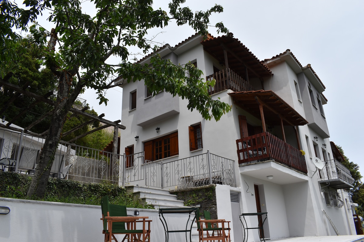 Na bujnoj zelenoj planini Pelion, u autentičnom selu, naša kuća kombinuje pristup moru (10 km) i skijalištu (7 km). Može da služi kao baza za šetnju ili vožnju do mnogih slikovitih sela i plaža ove planine. Kuća obuhvata baštu sa sjenovitim drvećem, takođe trešnje i kajsije u sezoni, a udaljena je samo dva minuta od mini pijace, restorana, apoteke i predivnog trga. Potpuno opremljen i opremljen mapama i knjigama o regionu.