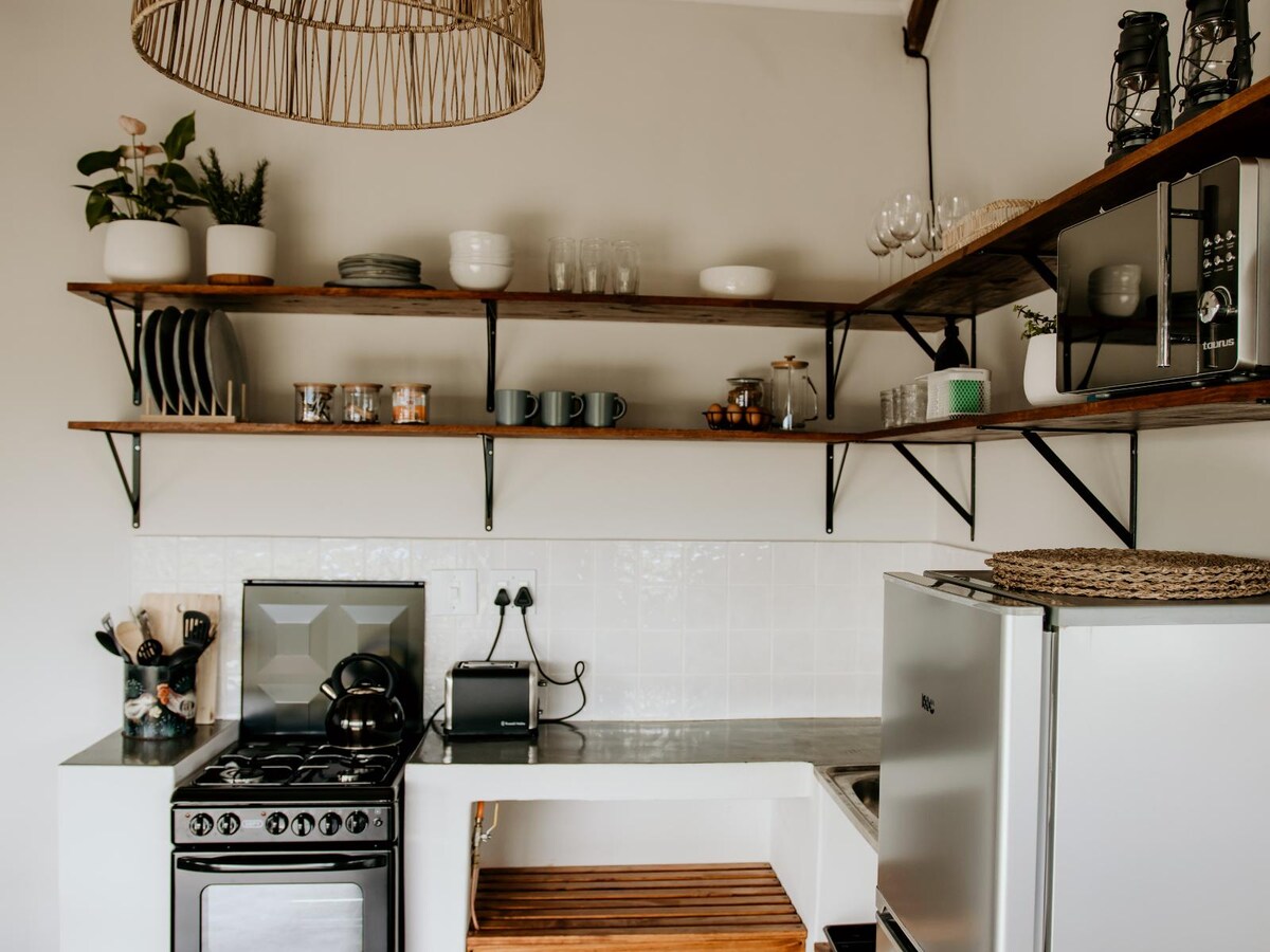 Luxury modern cottage situated 5 minute walk from Salt Rock beach. It is a 1 bedroom, 1 full bathroom with an open plan kitchen and lounge. There is a lovely firepit and a spacious covered veranda. Air conditioning throughout the house, WIFI and a 50'' smart TV. Free standing cottage that is very private, tranquil and surrounded by green vegetation. Perfect for those looking for a comfortable holiday house with their own space and prime location to the beach.