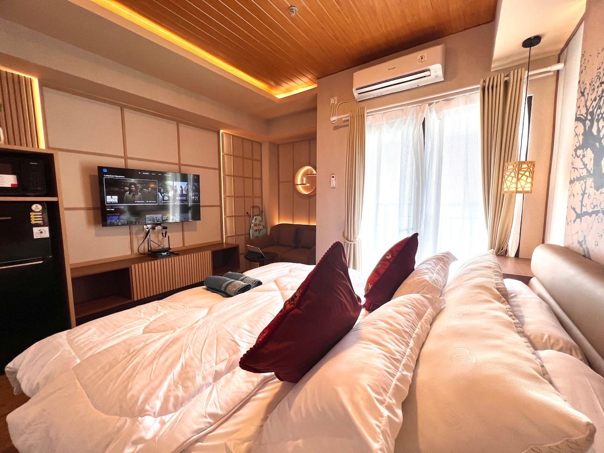 Professionally Managed by Kozystay Escape to a thoughtfully designed 2-bedroom retreat in Tangerang — blending Japanese-inspired calm with modern luxury, complemented by a private lift, loft-style layout, pool, gym, and a prime city location. AVAILABLE TO GUESTS: + Digital Check-in + Professionally Cleaned (disinfect) + Hotel Grade Amenities & Fresh Linens + Free High-Speed Wi-Fi & Cable TV + Free Access to Netflix