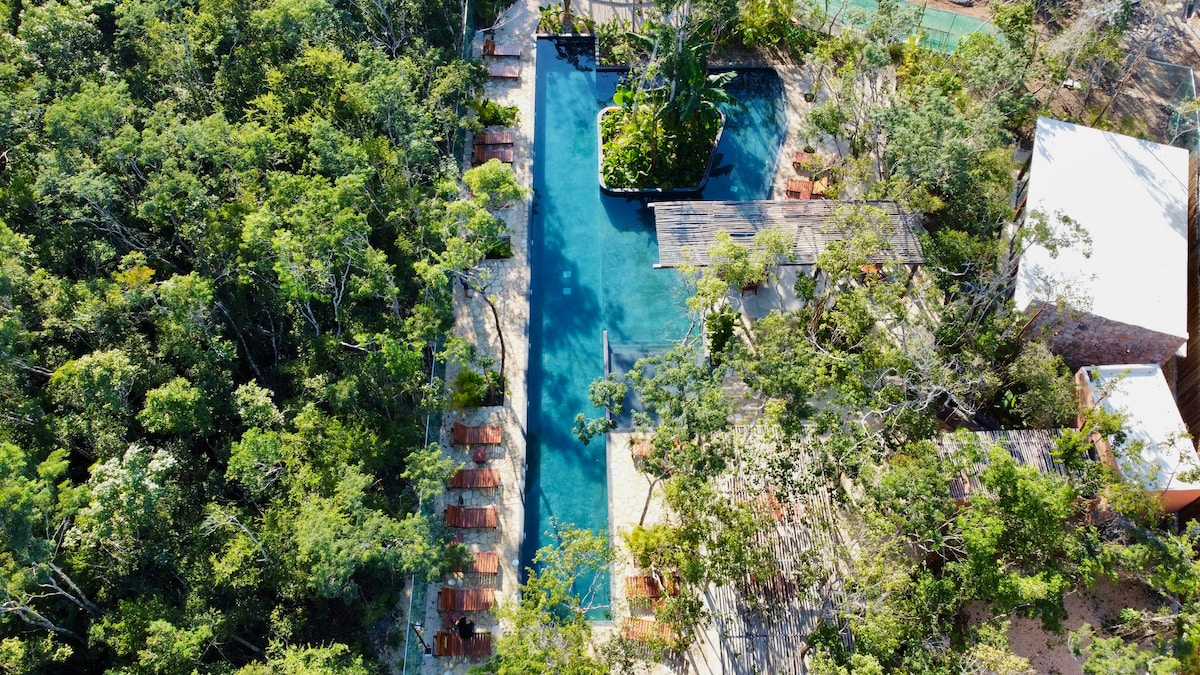 Jungle Oasis Loft w/ Private Plunge Pool & Terrace! Pobjegnite u ovo elegantno potkrovlje na 2. spratu s privatnom terasom i bazenom s pogledom na bujnu džunglu! Uživajte u besplatnim biciklima tokom boravka, potpuno opremljenoj čajnoj kuhinji i bezbjednosti non-stop kako biste bili spokojni. Dizajniran za parove, putnike koji putuju sami i digitalne nomade, ovaj moderni smještaj je udoban,tih i okružen prirodom, samo 15 minuta od plaže i centra grada! Opustite se u svom bračnom krevetu, zaronite u bazen ili istražite obližnje cenote,plaže i još mnogo toga!