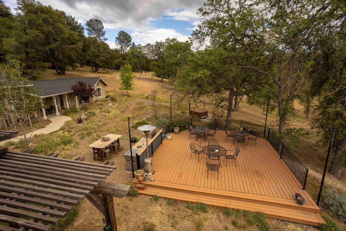 Nedavno renoviran (2018) iznad garažnog potkrovlja sa sopstvenim privatnim ulazom preko spiralnog stepeništa. Velika terasa sa spoljašnjim sedištima, kupatilom i malom čajnom kuhinjom sa mikrotalasnom/mini frižiderom/keurigom (bez šporeta/rerne). Iznad garažnog potkrovlja pričvršćeno je za našu glavnu kuću preko stepeništa sa zaključanim vratima. Nalazimo se 90 minuta do ulazne KAPIJE Josemitija, 135 minuta do sprata u dolini * u zavisnosti od saobraćaja: ljeto = prometnije. Moguće je da će biti potrebne rezervacije za park u špicu. 35 minuta do jezera Pinecrest i skijališta Dodge. 7 minuta do kazina Black Oak